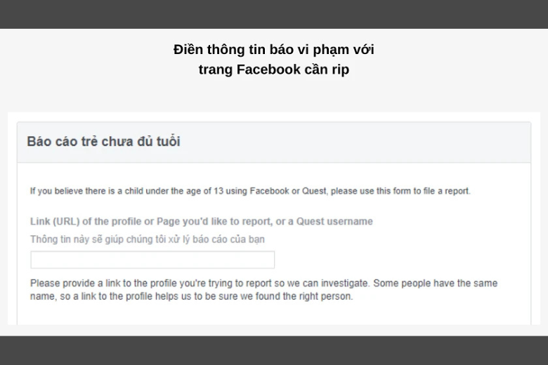 Bước 2: Báo cáo trang này vì lý do trẻ dưới 13 tuổi và chưa đủ tuổi sử dụng. Sao chép đường hyperlink của Fanpage bạn muốn RIP và dán vào khung đầu tiên.